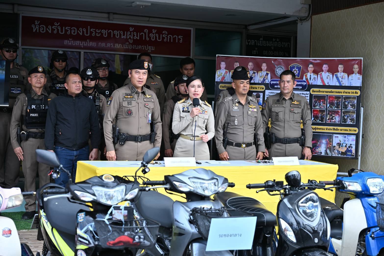 วันที่ 20 ตุลาคม 2568 ที่สถานีตำรวจภูธรเมืองนครปฐม นางสาวอโรชา นันทมนตรี ผู้ว่าราชการจังหวัดนครปฐม พร้อมด้วย พล.ต.ต.พิทักษ์ อุปพงษ์ ผู้บังคับการตำรวจภูธรจังหวัดนครปฐม พ.ต.อ.อชิรวัตติ์ ถาวรเจริญวัฒน์ ผกก.สภ.เมืองนครปฐม พ.ต.ท.ตะวัน วัฒนรังสรรค์ รอง ผกก.ป.สภ.เมืองนครปฐม และนายสืบสกุล อุดมกิจ ปลัดอาวุโสอำเภอเมืองนครปฐม ร่วมแถลงผลการจับกุมผู้ต้องหา ตามยุทธการ “ปิดเมือง สยบแว้นนครปฐม” หลังได้รับแจ้งจากพลเมืองดีว่ามีการรวมกลุ่มมั่วสุมแข่งขันรถในเส้นทางสาธารณะ บริเวณถนนศาลากลางตัดใหม่ ต.ถนนขาด อ.เมืองนครปฐม จำนวนหลายคัน สามารถจับกุมผู้ต้องหา ตามยุทธการ “ปิดเมือง สยบแว้นนครปฐม” จำนวน 7 ราย และพบเป็นเยาวชนโดยเรียกผู้ปกครองมาตักเตือน 24 คัน และยึดรถจักรยานยนต์เพื่อตรวจสอบเพิ่มเติม 14 คัน