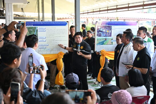 สำหรับวันนี้จังหวัดนครปฐม ที่บริเวณนี้ ได้รับการร้องเรียนจากผู้นำท้องถิ่น ท้องที่ และตัวแทนของพรรค ที่มีความต้องการสร้างประตูระบายน้ำ ซึ่งได้มีการหารือกันมาหลายปี จากแผนฯ กำหนดไว้ต้องใช้งบประมาณ พ.ศ. 2571 แต่ความเดือดร้อนที่ประชาชนได้รับผลกระทบ โดยเฉพาะโรงพยาบาลห้วยพลู ที่ต้องรองรับผู้ป่วยจากอำเภอนครชัยศรีและอำเภอใกล้เคียง และพื้นที่ชุมชนกว่า 200 ครัวเรือน เพราะปัญหาน้ำท่วม จึงได้สั่งการให้ปลัดกระทรวงเกษตรและสหกรณ์ ขออนุมัติในหลักการ เพื่อขออนุมัติใช้เงินเหลือจ่ายงบประมาณ พ.ศ. 2569 เพื่อเร่งดำเนินการก่อสร้าง ซึ่งคาดว่าแบบจะแล้วเสร็จ เดือนธันวาคม 2568 เมื่อแบบเสร็จจะได้มีการประสานมายังผู้ว่าราชการจังหวัดนครปฐม เพื่อขอใช้พื้นที่ในการก่อสร้าง ซึ่งถือเป็นเรื่องเร่งด่วน ที่ต้องดำเนินการแก้ไขปัญหา และอีกหนึ่งเรื่องเกี่ยวกับปัญหาลำน้ำสาขา ที่มีความตื้นเขิน อยู่ในความรับผิดชอบของกรมเจ้าท่า โดยได้หารือกับรองนายกรัฐมนตรี และรัฐมนตรีว่าการกระทรวงคมนาคม (นายพิพัฒน์ รัชกิจประการ) ได้มีความเห็นชอบ โดยมอบให้กรมชลประทาน เป็นผู้ดำเนินการที่มีความพร้อม ร่วมกับกระทรวงกลาโหม ไม่ว่าจะเป็น หน่วยบัญชาการทหารพัฒนา ที่มีเครื่องมือ หน่วยทหารช่าง ซึ่งได้มีการประสานเบื้องต้นแล้ว จะมาบูรณาการร่วมกันขุดลอก ทั้งนี้ ไม่ใช่แม่น้ำท่าจีน แต่ยังรวมไปถึงแม่น้ำสาขา แม่น้ำสายหลัก ที่ต้องมีการบูรณาการดำเนินการร่วมกันทั่วประเทศ