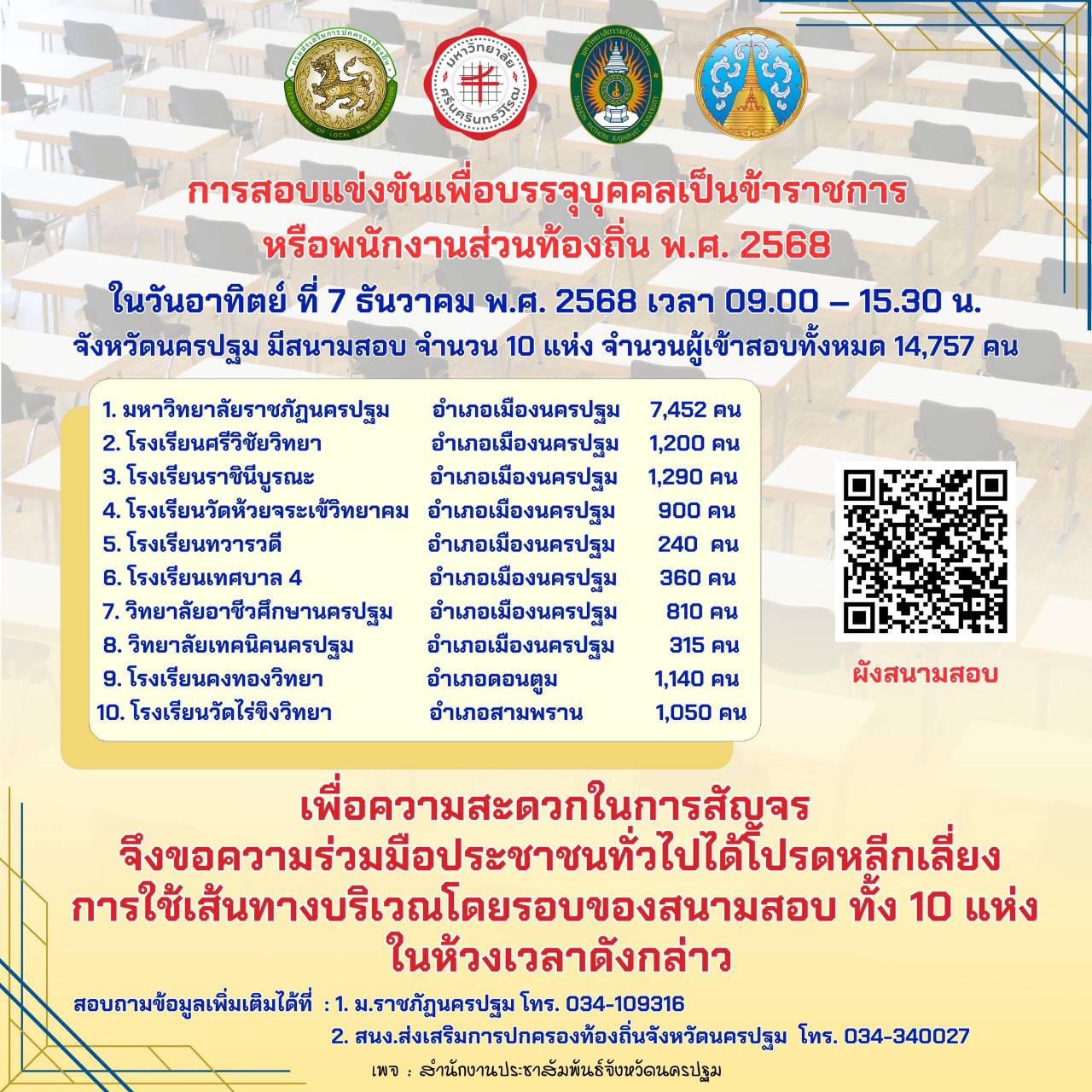 กรมส่งเสริมการปกครองท้องถิ่น ได้กำหนดให้มีการสอบแข่งขันเพื่อบรรจุบุคคลเป็นข้าราชการหรือพนักงานส่วนท้องถิ่น พ.ศ. 2568 จังหวัดนครปฐม มีสนามสอบ 10 แห่ง ผู้เข้าสอบ 14,757 คน ในวันอาทิตย์ที่ 7 ธันวาคม 2568 เวลา 09.00 – 15.30 น