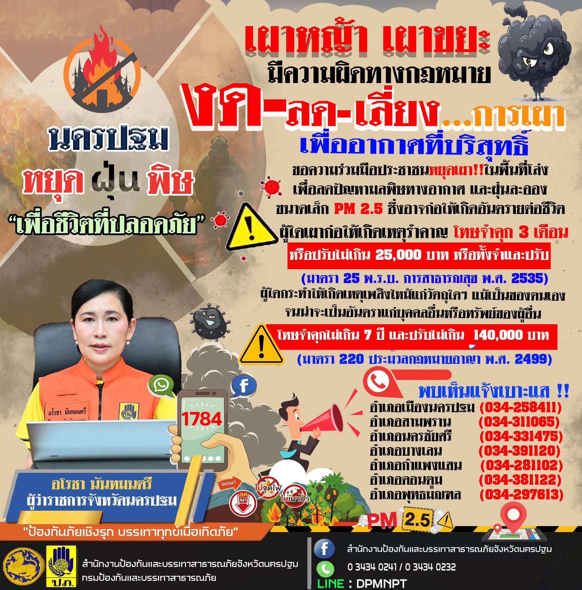 จึงขอความร่วมมือพี่น้องประชาชนชาวนครปฐม รวมพลังดำเนินการตามมาตรการ/แนวทางปฏิบัติ เพื่อควบคุมแหล่งกำเนิดฝุ่นพิษ ให้ #นครปฐมหยุดฝุ่นพิษเพื่อชีวิตที่ปลอดภั