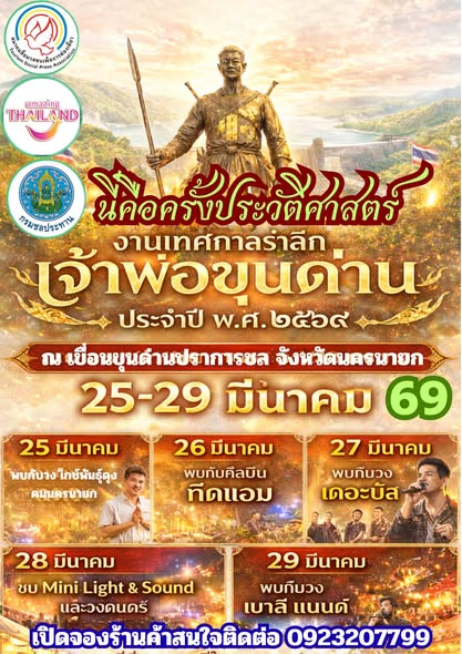 ขอเชิญชวนพี่น้องประชาชน นักท่องเที่ยว และผู้ที่รักและศรัทธาในเจ้าพ่อขุนด่าน มาร่วมเป็นส่วนหนึ่งของหน้าประวัติศาสตร์จังหวัดนครนายกร่วมสักการะสิ่งศักดิ์สิทธิ์มร่วมสัมผัสตำนานความกล้าหาญ ร่วมสนับสนุนสินค้าชุมชนและร่วมกันสร้างพลังแห่งศรัทธาให้ดังก้องไปทั่วผืนแผ่นดินตะวันออก 25–29 มีนาคม 2569 ณ ศาลเจ้าพ่อขุนด่าน และลานท้ายเขื่อนขุนด่านปราการชล จังหวัดนครนายกนครนายก…เมืองด่านแห่งตะวันออก พร้อมเปิดประวัติศาสตร์หน้าใหม่ไปด้วยกัน