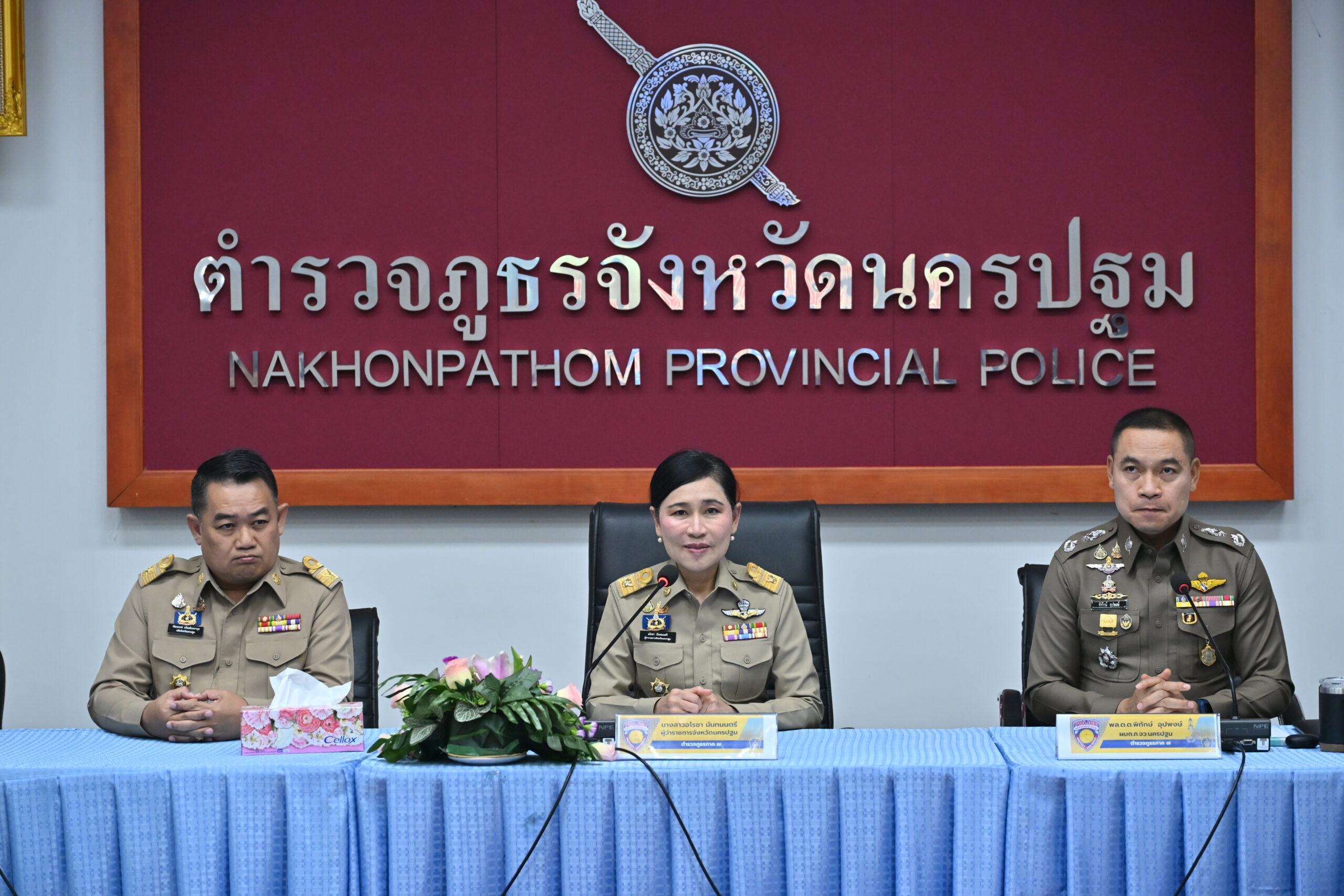วันที่ 30 มีนาคม 2569 ที่ห้องประชุม ตำรวจภูธรจังหวัดนครปฐม นางสาวอโรชา นันทมนตรี ผู้ว่าราชการจังหวัดนครปฐม พร้อมด้วย พลตำรวจตรี พิทักษ์ อุปพงษ์ ผู้บังคับการตำรวจภูธรจังหวัดนครปฐม ปลัดจังหวัดนครปฐม และรองผู้บังคับการตำรวจภูธรจังหวัดนครปฐม ร่วมแถลงผลการจับกุมผู้ต้องหาในคดียาเสพติด ภายใต้ปฏิบัติการ พิทักษ์นครปฐม ทลายเครือข่ายยาเสพติด โดยเมื่อวันที่ 27 มีนาคม 2569 เจ้าหน้าที่ตำรวจชุดสืบสวน สถานีตำรวจภูธรบางเลน ร่วมกับ ฝ่ายปกครองอำเภอบางเลน ลงพื้นที่ตรวจค้นและจับกุมผู้ต้องหาคดียาเสพติด ในพื้นที่ตำบลลำพญา พร้อมของกลางยาบ้า 882,102 เม็ด, เคตามีน 6.43 กรัม, โทรศัพท์มือถือ และรถยนต์ อีกทั้งยึดทรัพย์สินไว้เพื่อตรวจสอบ ได้แก่ รถยนต์กระบะ 1 คัน, บัตร ATM และคันเบ็ด 17 คัน รวมมูลค่าทรัพย์สิน 3,300,000 บาท และออกหมายจับผู้ร่วมขบวนการจำหน่ายยาเสพติดเพิ่มเติมอีก 1 ราย